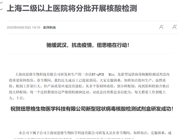 我司戰(zhàn)略合作伙伴紐思格生物充分發(fā)揮企業(yè)的優(yōu)勢(shì),積極響應(yīng)人民需求,在疫情爆發(fā)初期就不計(jì)成本,不計(jì)付出投入各種酶、Master Mix和核酸提取試劑的生產(chǎn)研發(fā),經(jīng)過(guò)全體員工夜以繼日的努力,紐思格于2月7日宣布新型冠狀病毒核酸檢測(cè)試劑盒研發(fā)成功,為抗擊疫情奉獻(xiàn)綿薄之力。