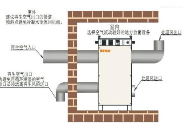 除濕機置于室內:再生風進口和再生空氣岀口管道必須要置在外界環境。干空氣必須散布在除濕房間 內,處理風進口不需要連接C