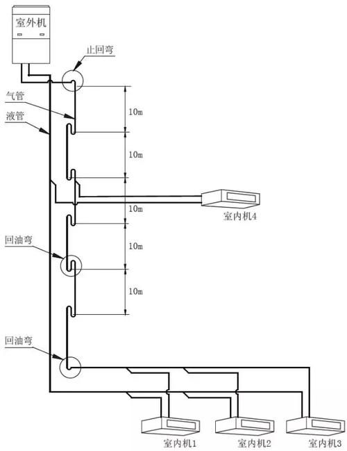 當系統(tǒng)室內外機之間存在落差時,氣管的立管部分從下往上每隔10m 處安裝一個存油彎。