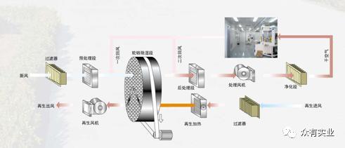 轉(zhuǎn)輪除濕機(jī)的工作流程可分幾個(gè)部分完成:預(yù)冷 / 預(yù)熱( 供選件 ) — 轉(zhuǎn)輪除濕 —后冷 / 后熱( 供選件 )