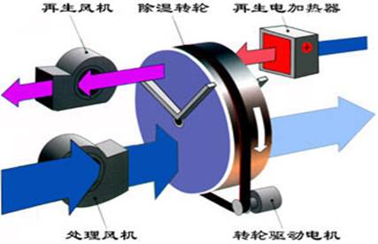轉輪除濕機的核心部件是一個蜂窩狀轉輪,轉輪由特殊陶瓷纖維載體和活性硅膠復合而成;裝輪兩側由特制的密封裝置將其分成兩個區域:處理區域及再生區域;當需要除濕的潮濕空氣通過裝輪的處理區域時,濕空氣的水蒸汽被轉輪的活性硅膠所吸附,干燥空氣被處理風機送至需要處理的空間;而不斷緩慢轉動的轉輪載著趨于飽和的水蒸汽進入再生區域;再生區內反向吹入的高溫空氣使得轉輪中吸附的水份被脫附,被風機排出室外,從而使轉輪恢復了吸濕的能力而成為再生過程,轉輪不斷的轉動,上述的除濕及再生周而復始的進行,從而保證除濕機持續穩定的除濕狀態。
