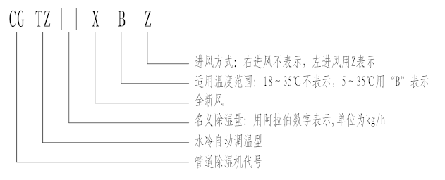 2. CGTZ200XZ:表示名義除濕量為200kg/h,進風方式為左進風,適用溫度范圍為18℃~35℃的全新風水冷自動調(diào)溫型管道除濕機